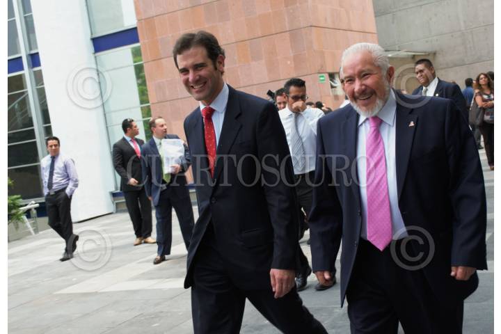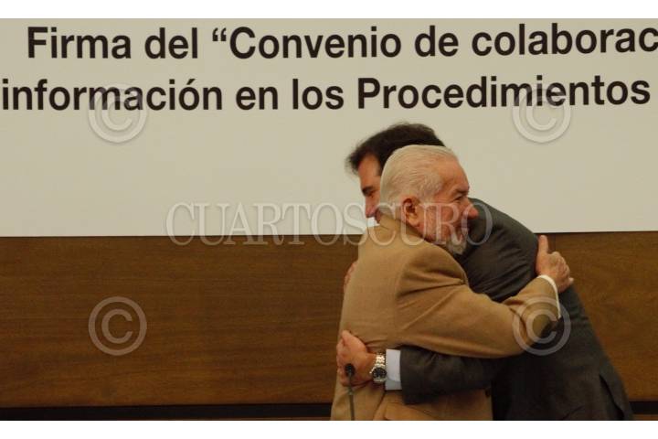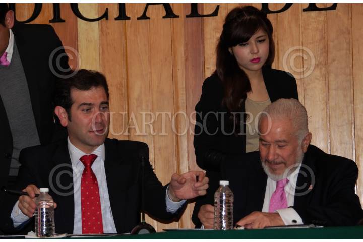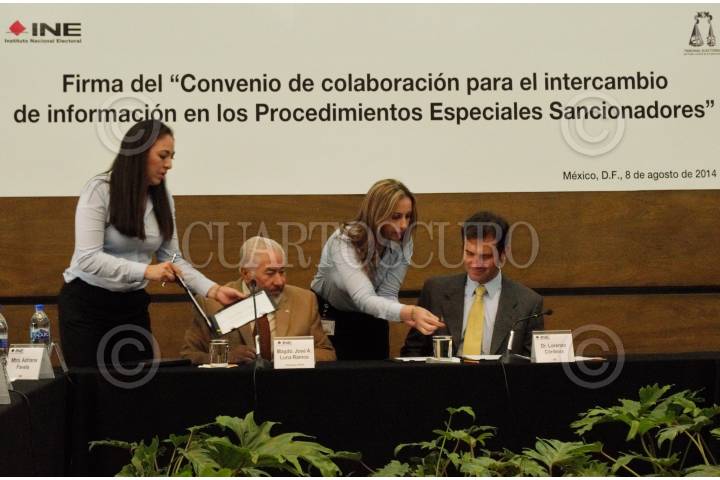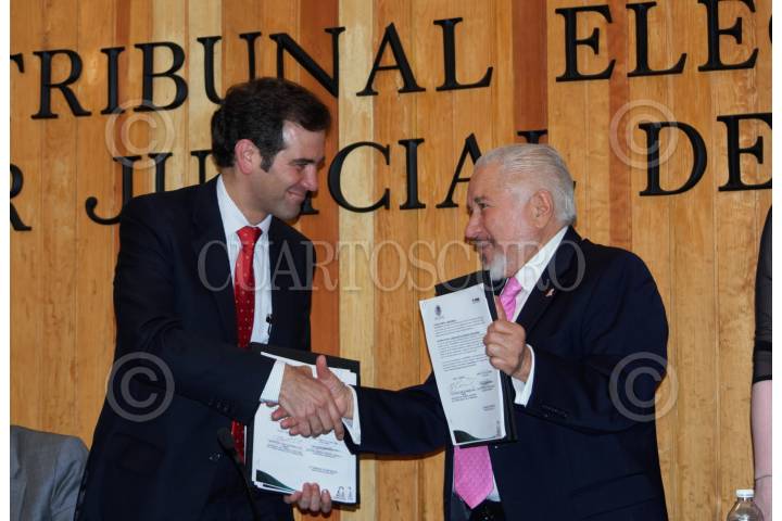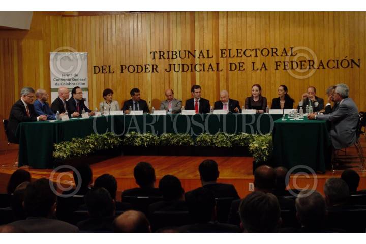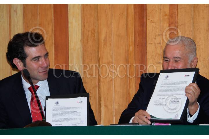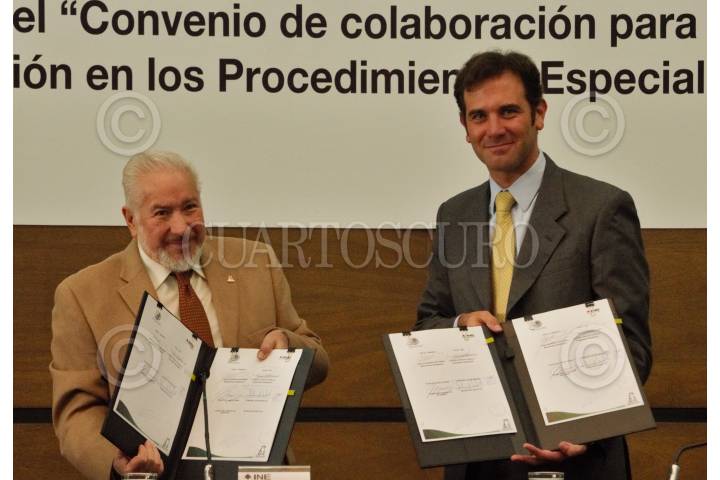 MÉXICO, D.F., 13MAYO2014.- Lorenzo Córdova, consejero presidente del Instituto Nacional Electoral (INE) y Alejandro Luna Ramos, ministro presidente del Tribunal Electoral del Poder Judicial de la Federación, firmaron un Convenio de Colaboración por parte de ambas instituciones para hacer públicas las acciones conjuntas a futuro entre los dos órganos electorales. “Para el Tribunal Electoral del Poder Judicial de la Federación es un privilegio ser el primer órgano jurisdiccional con quien el renovado organismo celebra un convenio; lo cual demuestra el interés de ambas instituciones en estrechar los lazos de cooperación para fortalecer la democracia mexicana”, mencionó el ministro. FOTO: MARÍA JOSÉ MARTÍNEZ /CUARTOSCURO.COM