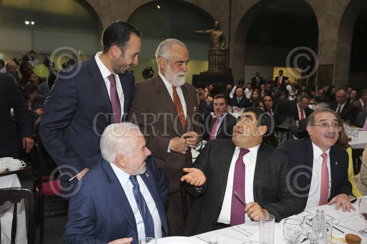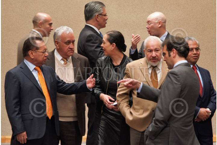 MÉXICO, D.F., 04FEBRERO2015.- Los senadores Roberto Gil Zuarth y Miguel Barbosa conversan con Diego Fernández de Ceballos y el magistrado Alejandro Luna Ramos, durante la presentación del Informe de la Comisión de Justicia, en la vieja casona de Xicontécatl. FOTO: CUARTOSCURO.COM