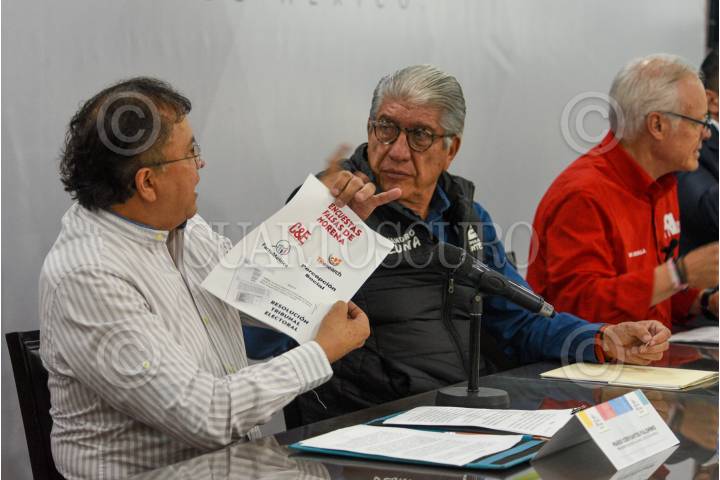 Mario Cervantes Palominos presidente de Nueva Alianza en el Estado de México durante la conferencia de prensa ofrecida de manera conjunta con los líderes estatales del PRI y PAN.