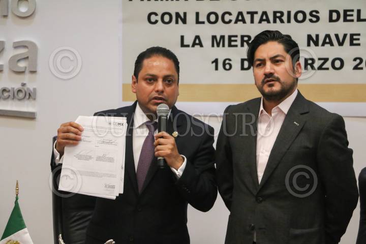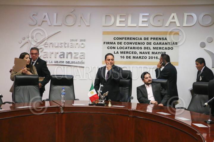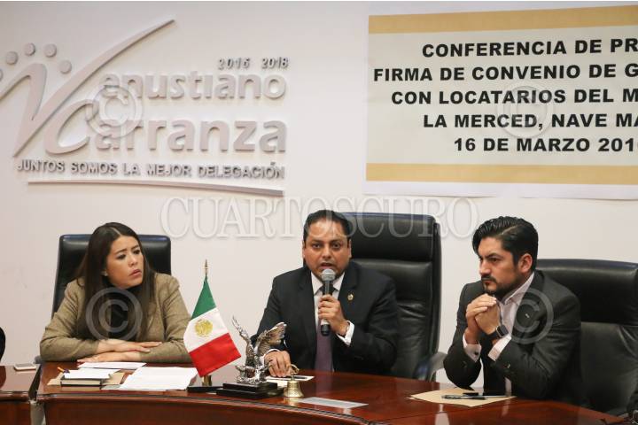 CIUDAD DE MÉXICO, 16MARZO2016.- Israel Moreno, delegado en Venustiano Carranza, acompañado de Alejandro Piña, Alejandro Piña Medina, Director General de Abasto de la SEDESO, durante la conferencia y firma de convenio de la sgarantias con los locatarios de la nave mayor del mercado de la Merced. FOTO: SAÚL LÓPEZ /CUARTOSCURO.COM