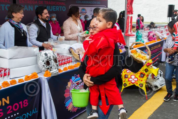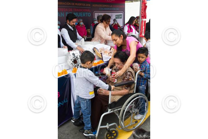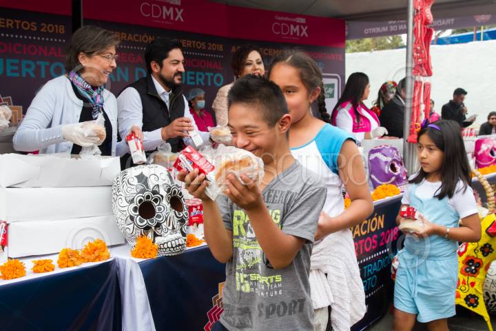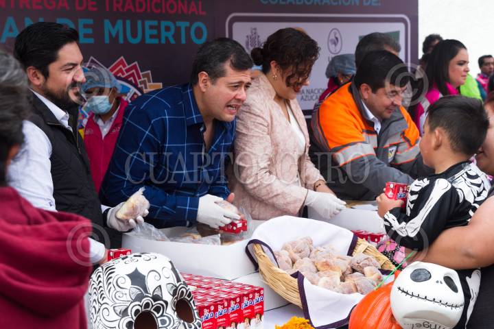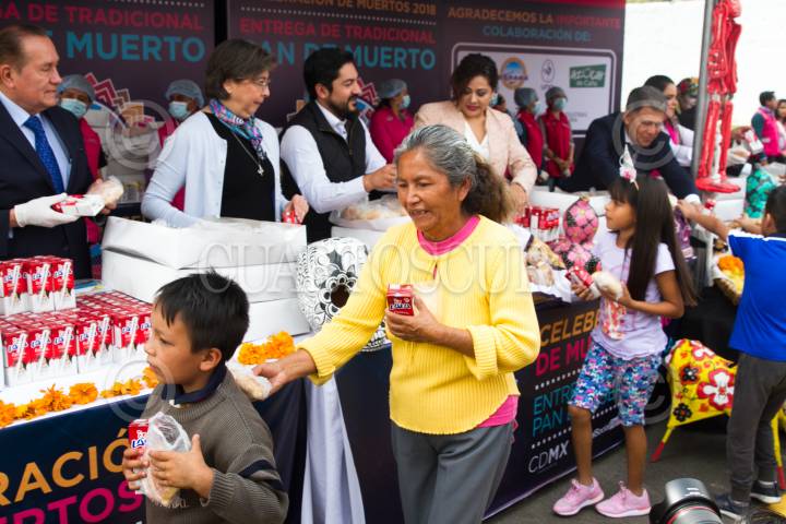 CIUDAD DE MÉXICO, 01NOVIEMBRE2018.- Ante el retraso de la llegada del Jefe de Gobierno, Ramón Amieva, el secretario de Desarrollo Social, Alejandro Piña Medina, tuvo que iniciar con el reparto del tradicional pan de muerto a decenas de capitalinos que se congregaron afuera de la estación del metro panteones, niños difsrazados acompañados de sus padres y abuelos se acercaron con alegría a recoger la pieza del pan, también se les entregaba una lechita. Al llegar al lugar Amieva Gálvez se acercó a repartir, pero solo por unos instantes, señaló que se repartieron 55 mil piezas de pan de muerto en tres diferentes puntos. FOTO: MOISÉS PABLO /CUARTOSCURO.COM