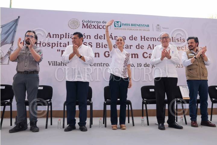 CENTRO, TABASCO, 19JULIO2025.- Claudia Sheinbaum, presidenta de México, encabezó el acto protocolario por la Ampliación del área de hemodiálisis, Hospital de Alta Especialidad IMSS-Bienestar. Centro, Tabasco. Acompañan a la presidenta: David Kershenobich, secretario de salud; Zoé Alejandro Robledo Aburto, director general del Instituto Mexicano del Seguro Social (IMSS); Alejandro Svarch Pérez, director general del IMSS Bienestar; y Javier May Rodríguez, gobernador de Tabasco. FOTO: PRESIDENCIA/CUARTOSCURO.COM
