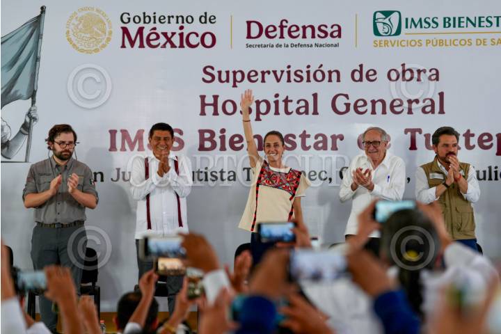 TUXTEPEC, OAXACA, 19JULIO2025.- Claudia Sheinbaum, presidenta de México, durante la Supervisión de obra Hospital General IMSS-Bienestar Tuxtepec. La acompañan: Alejandro Svarch Pérez, director general del IMSS Bienestar; Salomón Jara, gobernador de Oaxaca; David Kershenobich, secretario de Salud, y Zoé Alejandro Robledo Aburto, director general del Instituto Mexicano del Seguro Social (IMSS). FOTO: PRESIDENCIA/CUARTOSCURO.COM