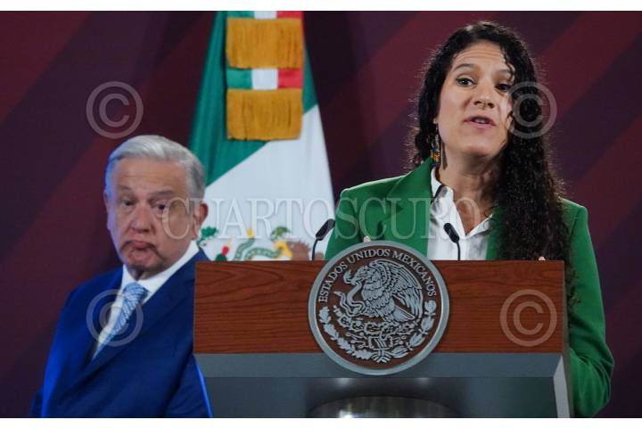 Andrés Manuel López Obrador y Bertha Luján Alcalde durante la conferencia matutina desde Palacio Nacional.