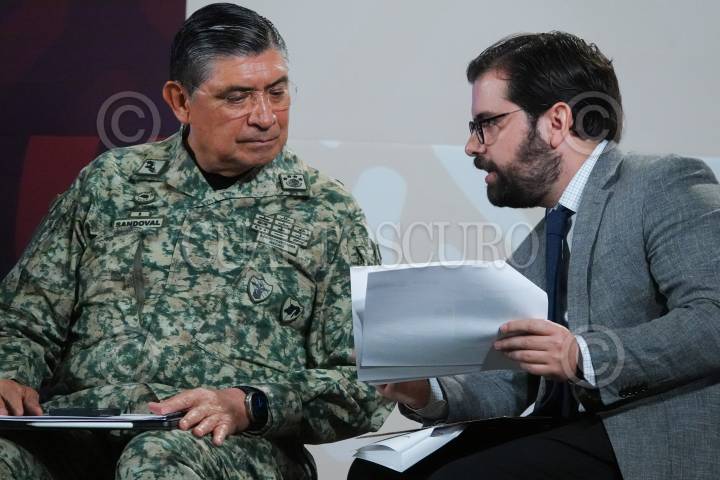 Luis Cresencio Sandoval y Alejandro Svarch conversan durante la conferencia matutina desde Palacio Nacional.