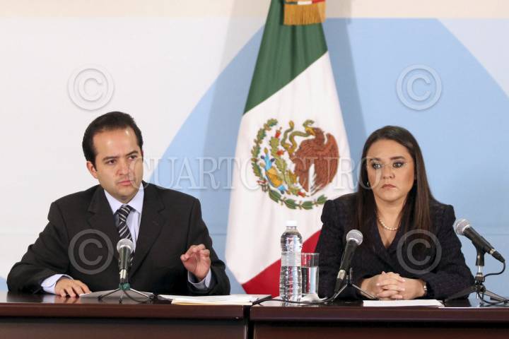 MÉXICO, D.F., 07DICIEMBRE2011.- Alejandro Poiré, secretario de gobernación y Alejandra Sota Mirafuentes, coordinadora general de Comunicación Social de la presidencia de la República y vocera del gobierno federal, ofrecieron un mensaje a medios de comunicación en donde dieron a conocer la operación “Huésped”, con la que el gobierno federal impidió el ingreso de Saadi Gadafi, hijo del ex líder libio Muamar Gadafi, a territorio mexicano. FOTO: CUARTOSCURO.COM