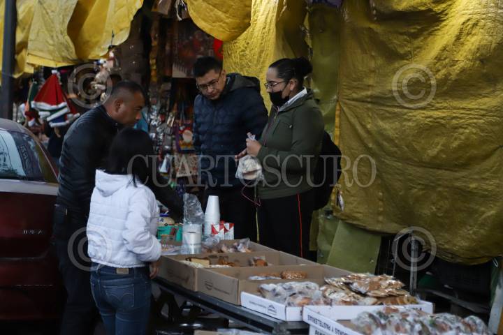 Puestos ambulantes venden bebidas calientes y pan a los transeúntes que salen en la mañana de Navidad.