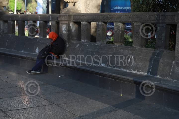 Una persona en situación de calle duerme en una banca pese a las bajas temperaturas que se registran en la ciudad.