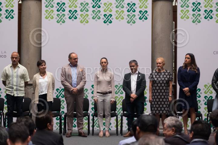 CIUDAD DE MÉXICO, 26MAYO2019.- Jesús Esteva Medina, secretario de Obras y Servicios; Marina Robles, secretaria de Medio Ambiente; Klaus Rudischhauser, embajador de la Unión Europea; Claudia Sheinbaum, jefa de Gobierno, Sergio Sánchez Martínez, subsecretario de la Secretaria del Medio Ambiente y Recursos Naturales (SEMARNAT) y Alessandra de la Vega, diputada local por el Partido Verde Ecológista, al termino de la presentación del Programa "Basura Cero y Economía Circular", el cual consiste en la reducción de generación de basura y el manejo de residuos sólidos para no enviarlos a rellenos sanitarios. Se realizó en el patio del Antiguo Palacio de Ayuntamiento. FOTO: GRACIELA LÓPEZ /CUARTOSCURO.COM
