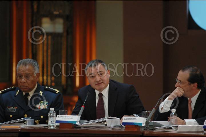 MÉXICO, D.F., 26NOVIEMBRE2009.-El general Guillermo Galvan, secretario de la Defensa Nacional; Genaro Garcia Luna, secretario de Seguridad Pública y Miguel Alessio Robles, consejero juridico del Ejecutivo Federal durante la XXVII Sesión del Consejo Nacional de Seguridad Pública que se realizo en el Salón Tesorería de Palacio Nacional. FOTO: RODOLFO ANGULO/CUARTOSCURO.COM