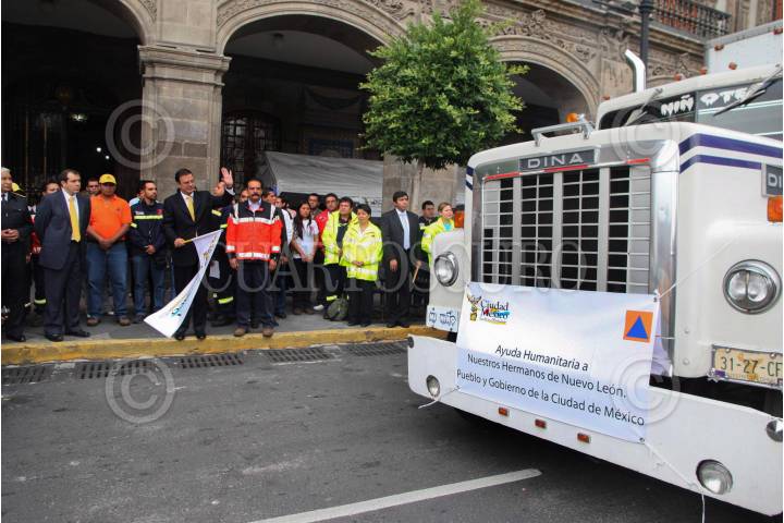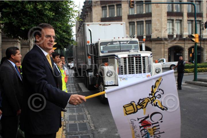 MÉXICO, D.F., 12JULIO2010.- Marcelo Ebrard Casaubon, Jefe de Gobierno Capitalino, dio el banderazo de salida a los camiones con ayuda humanitaria hacia los estado que fueron afectados por el paso del huracán Alex. FOTO: CUARTOSCURO.COM