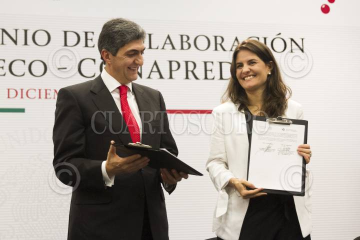 CIUDAD DE MÉXICO, 07DICIEMBRE2016.- Ernesto Nemer Álvarez, titular de la Procuraduría Federal del Consumido (Profeco), y Alexandra Haas Paciuc, Consejo Nacional para Prevenir la Discriminación (Conapred), firmaron un convenio para crear un manual de derechos de las personas que tienen una discapacidad al momento de solicitar un servicio, el encuentro fue en la sede de la procuraduría. FOTO: MOISÉS PABLO /CUARTOSCURO.COM