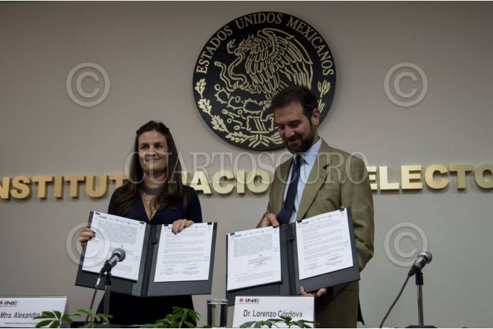 CIUDAD DE MÉXICO, 13MAYO2016.- Lorenzo Cordóva, consejo presidente del Instituto Nacional Electora y Alexandra Haas, presidenta del Consejo Nacional para Prevenir la Discriminación, firmaron un convenio con el cual buscan eliminar las problemáticas en materia de discriminación dentro de los procesos electorales. La presidenta del CONAPRED reiteró que los espacio políticos antes de ser utilizados para contrastar ideas propositivas y respetuosas son motivo de comentarios discriminatorio. Al termino de la firma se presentaron algunos instrumentos para integrar a las personas con alguna limitante física para participar en el siguiente proceso electoral. FOTO: GALO CAÑAS /CUARTOSCURO.COM