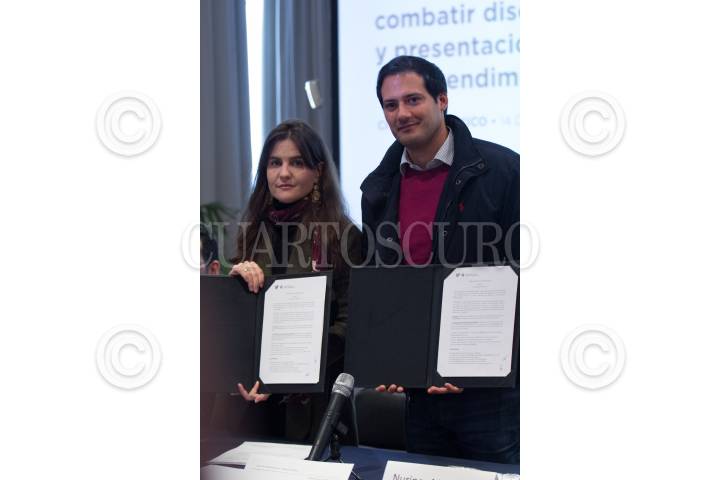 CIUDAD DE MÉXICO, 14DICIEMBRE2017.- Alexandra Hass, titular del Consejo Nacional para Prevenir la Discriminación (CONAPRED), y Hugo Rodríguez Nicolat, Gerente de Políticas Públicas para México y Latinoamérica en Twitter, durante la firma del memorando de Entendimiento con Twitter y la presentación de acciones del Conapred contra los discursos discriminatorios en redes sociales. FOTO: GALO CAÑAS /CUARTOSCURO.COM
