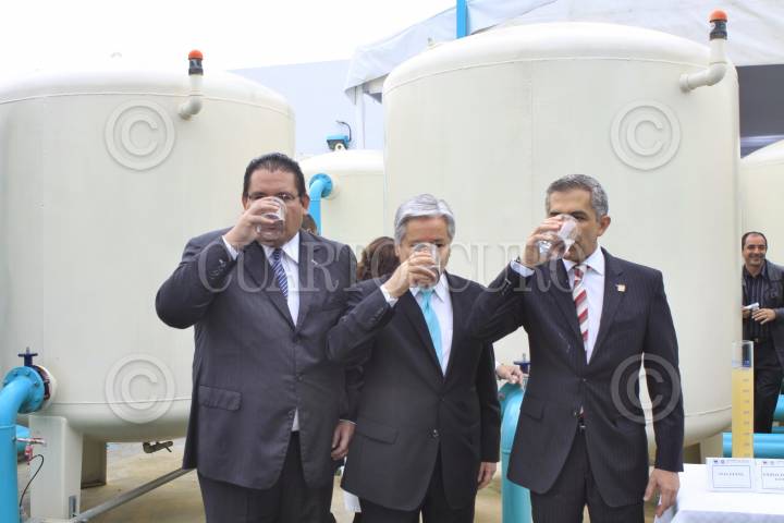 MÉXICO, D.F., 20AGOSTO2014.- José Manuel Ballesteros jefe delegacional de Venustiano Carranza, Alfonso Sarabia de la Garza, director del Aeropuerto Internacional de la Ciudad de México, y Miguel Ángel Mancera, Jefe de Gobierno, pusieron en marcha la planta potabilizadora Vista Alegre, que proporcionará de agua al aeropuerto de la capital. FOTO: MOISÉS PABLO /CUARTOSCURO.COM
