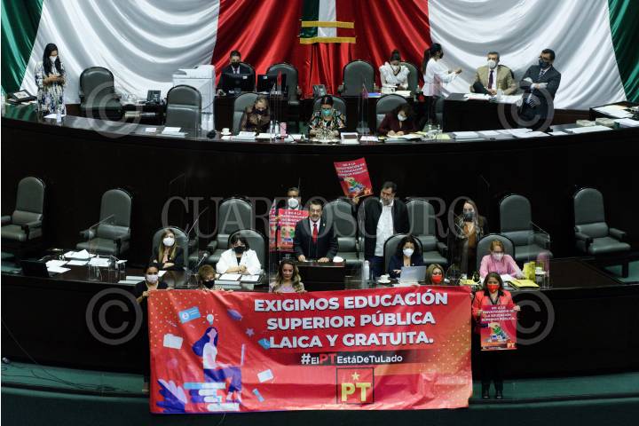 Alfredo Femat Bañuelos, diputado del PT, e integrantes del mismo grupo parlamentario, durante su participación en contra de la Ley General de Educación Superior.