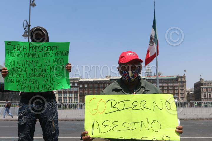 Integrantes de la Alianza Fraternal Suprema Mexicana de Chimalhuacán, Estado de México, protestaron enfrente de Palacio Nacional para exigir apoyo a los comerciantes que desde el 26 de marzo no han podido realizar sus labores
