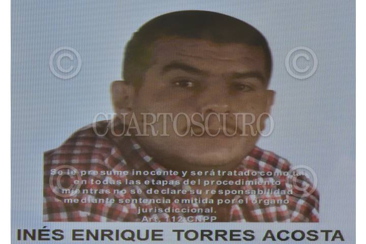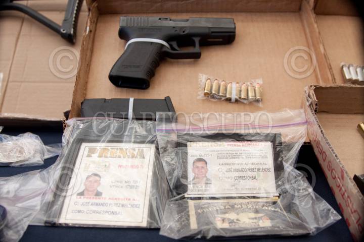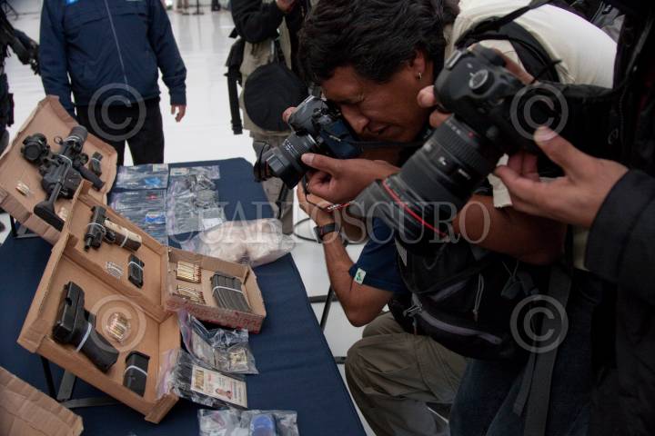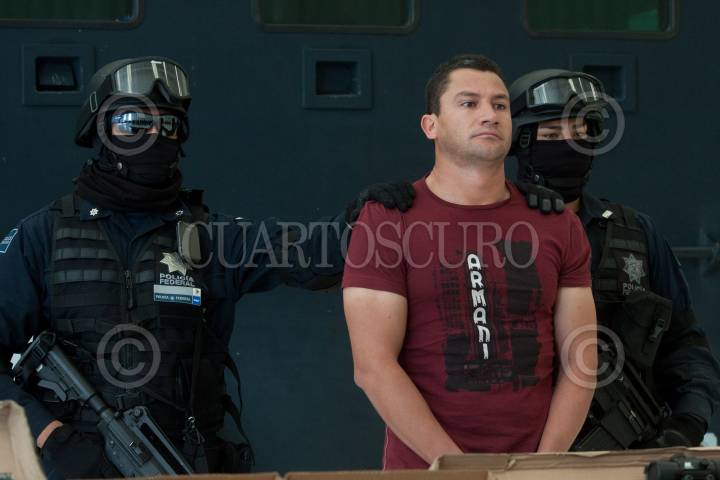 MÉXICO, D.F., 04FEBRERO2012.- En instalaciones de la Policía Federal presentaron a José Antonio Torres Marrufo alías "Marrufo", identificado como líder de la organización conocida como Gente Nueva brazo armado del Cártel del Pacífico al servicio de Joaquín Guzmán Loera. Entre las pertenencias que se le aseguraron fueron dos armas cortas, dos armas largas, droga conocida como "crystal", una camioneta Land Rover, equipo de comunicación y credenciales que lo acerditaban como miembro de la Confederación Internacional de Prensa Mexicana A. C. En esta acción, también se logró la detención de Manuel Alonso Magaña Barajas, de 26 años de edad, originario de Mazatlán, Sinaloa, quien le brindaba seguridad a Torres Marrufo. FOTO: MOISÉS PABLO/CUARTOSCURO.COM