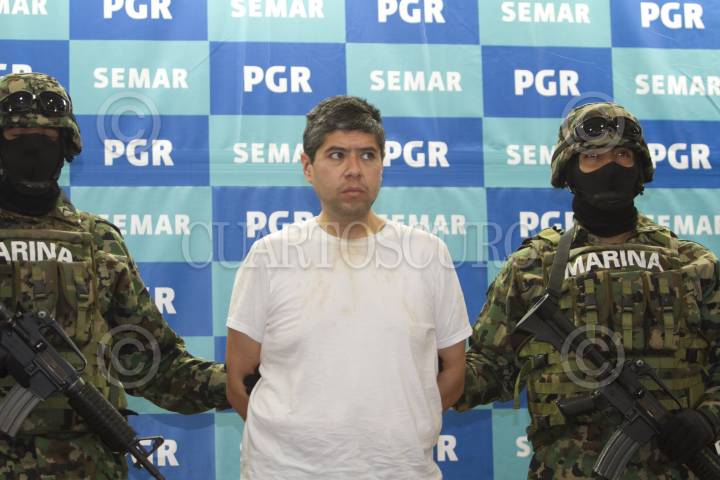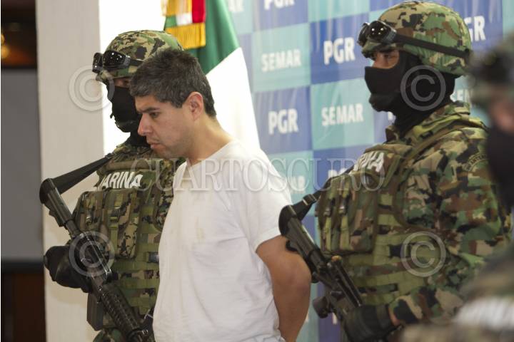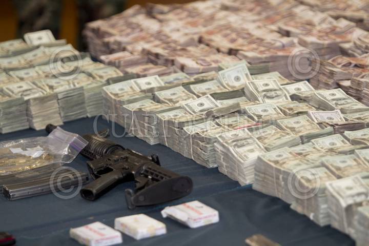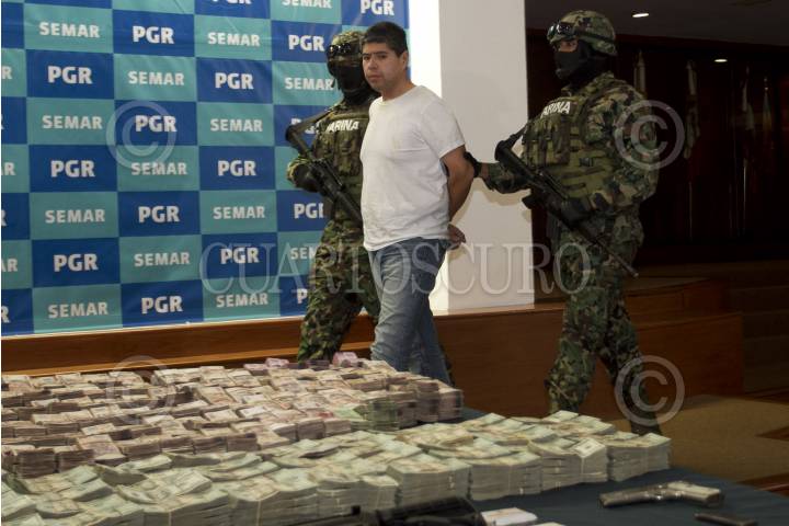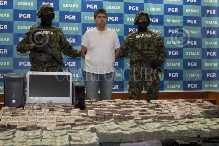 MÉXICO, D.F. 15JUNIO2012.- Personal de la Marina Armada de México, presento en las intalaciones de la SIEDO a Eric Jovan Lozano Díaz alias “Chucho” presunto operador financiero de Miguel Ángel Treviño Morales alias “Z 40” quien fue detenido en una casa de seguridad en Nuevo Laredo, Tamaulipas y quien mantenía en su poder 36 millones 111mil, 650 pesos además de un millón 48 mil, 919 dólares americanos, el asegurado dio a conocer que en su oficina cerca del lugar de la detención tenia guardado más dinero durante la revisión a citado lugar fueron localizados otros 5 millones de pesos. También le fueron aseguradas 10 dosis de polvo blanco con las características de la cocaína, dos armas largas, un arma corta, alrededor de 300 cartuchos útiles de diferentes calibres. FOTO: GUILLERMO PEREA /CUARTOSCURO.COM