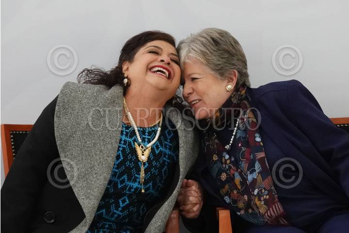 CIUDAD DE MÉXICO, 07ENERO2025.- Clara Brugada, jefa de Gobierno, y Alicia Bárcena, secretaria de Medio Ambiente y Recursos Naturales de México, conversaron durante la firma de convenio de coordinación para proteger el Bosque de Agua realizado en en la quinta colorada del Bosque de Chapultepec. FOTO: GRACIELA LÓPEZ/CUARTOSCURO.COM