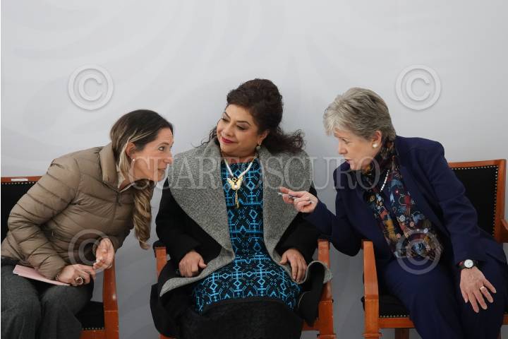 CIUDAD DE MÉXICO, 26FEBRERO2025.- Alicia Barcena, titular de Semarnat; Claudia Curiel de Icaza, secretaria de Cultura, y Martí Batres, director del ISSTE, conversaron durante el 112 Aniversario de Francisco I Madero realizado en el Patio de Honor en Palacio Nacional. FOTO: GRACIELA LÓPEZ/CUARTOSCURO.COM