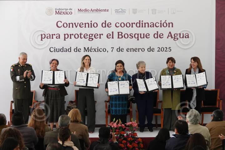 CIUDAD DE MÉXICO, 07ENERO2025.- Mariana Boy, titualar de la Procuraduria Federal de Proteccion al Ambiente; Clara Brugada, jefa de Gobierno; Alicia Bárcena, secretaria de Medio Ambiente y Recursos Naturales de México; Delfina Gómez, gobernadora del estado de México, y Margarita González Saravia, gobernadora de Morelos, mostraron la firma de convenio de coordinación para proteger el Bosque de Agua realizado en en la quinta colorada del Bosque de Chapultepec. FOTO: GRACIELA LÓPEZ/CUARTOSCURO.COM