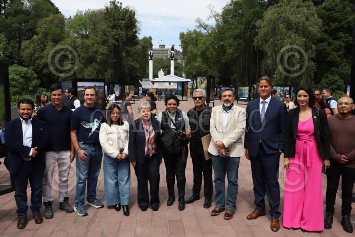 CIUDAD DE MÉXICO, 14JULIO2025.- La titular de la Semarnat, Alicia Bárcena, se toma un fotografía con los fotógrafos participantes en la exposición "Agua, Biodiversidad y Conservación", la cual se encuentra en el Bosque de Chapultepec. FOTO: DANIEL AUGUSTO/ CUARTOSCURO.COM