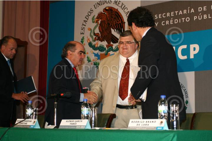 MÉXICO, D.F., 12MAYO2008.- Luis Tellez, Secretario de Comunicaciones y Trasportes saluda al Secretario de Hacienda, Agustin Carstens, durante la primera sesión del comité técnico del fondo nacional de infraestuctura. FOTO: SAÚL LÓPEZ/CUARTOSCURO.COM
