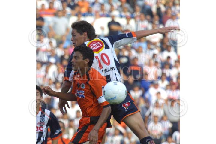 MONTERREY, N.L. 02OCTUBRE2004 Guillermo Franco de Monterrey y Sergio Almaguer de Chiapas, pelean el balón durante el partido Partido realizado en el Estadio Tecnológico de esta ciudad donde los regiomontanos vencieron 5 goles a 1 a los chiapanecos. FOTO: Jorge López/CUARTOSCURO.COM