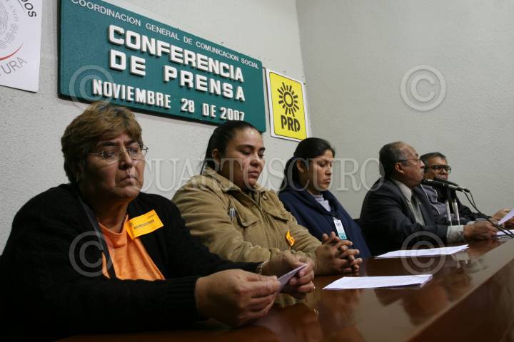MÉXICO D.F. 08MAYO2007.- Ante la resolución de la pena de 67 años para los dirigentes del pueblo de Atenco, se llevo a cabo una conferencia de prensa para dar a conocer el descontento del PRD; a la cita asistieron: Aliet Bautista, integrante de la mesa directiva de la coordinación de derechos humanos del grupo parlamentario, Antonio Almazan, diputado del PRD ante la SME, junto a Javier González, coordinador del PRD en el grupo parlamentario y Luis Sánchez Jímenez, vocero del PRD, también en el grupo parlamentario. FOTO: GUILLERMO MARTÍNEZ/CUARTOSCURO.COM