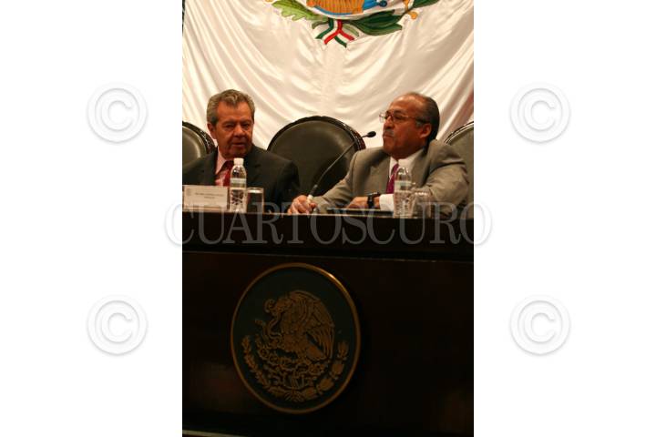 MÉXICO D.F. 28MAYO2008.-Porfirio Muñoz Ledo, integrante del FAP, acudió a la Cámara de Diputados donde participo en el Foro Análisis de la Contra Reforma Labora de la Secretaría del Trabajo. En la imagen es acompañado por el diputado del PRD, Antonio Almazan. FOTO: GUILLERMO PEREA/CUARTOSCURO.COM