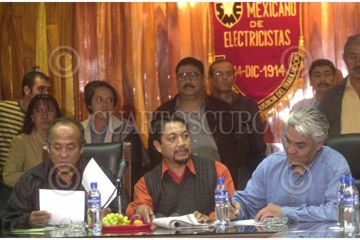 MEXDF25JUNIO2004.- Antonio Almazan, secretario del trabajo de la SME, Moises Flores y Carlos Rodriguez Canchola integrantes de la organización de trabajadores de la industria petrolera ofrecieron una conferencia de prensa en donde dieron su postura sobre la marcha en contra de la violencia que se realizará el próximo 27 de Junio. FOTO: Eunice Adorno/CUARTOSCURO.COM