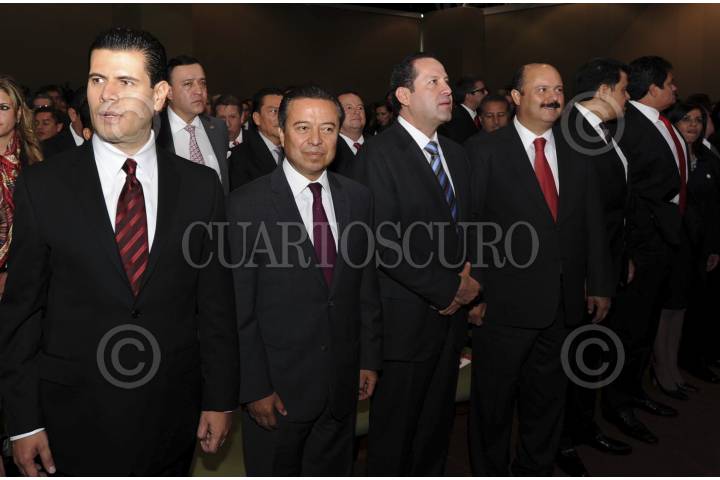 MÉXICO, D.F. 06DICIEMBRE2011.- Ruben Moreira, gobernador del estado de Coahuila; Carlos Lozano de la Torre, gobernador del estado de Aguascalientes; Marcelo Ebrard, jefe de gobierno del Distrito Federal; José Calzada Rovirosa, gobernador del estado de Queretaro y Miguel Álonso Reyes, gobernador del estado de Zacatecas durante la XLII Reunión Plenaria de Gobernadores de la Conferencia Nacional de Gobernadores (CONAGO) que se realizó en el C4. FOTO: RODOLFO ANGULO/CUARTOSCURO.COM