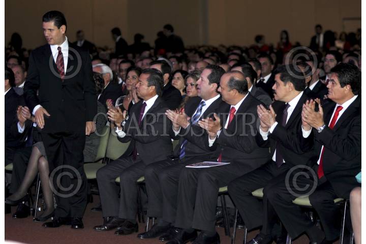 MÉXICO, D.F. 06DICIEMBRE2011.- Jorge Osuna Millan, gobernador del estado de Baja California; Francisco Olvera Ruíz gobernador del estado de Hidalgo; Fernando Ortega Bernes, gobernador del estado de Campeche; Ruben Moreira, gobernador del estado de Coahuila; Carlos Lozano de la Torre, gobernador del estado de Aguascalientes; Marcelo Ebrard, jefe de gobierno del Distrito Federal; José Calzada Rovirosa, gobernador del estado de Queretaro; Roberto Borgue, gobernador de Quintana Roo; Miguel Álonso Reyes, gobernador del estado de Zacatecas; Rafael Moreno Valle, gobernador del estado de Puebla; Ivonne Ortega, gobernadora del estado de Yucatán y Egidio Torres Cantú, gobernador del estado de Tamaulipas durante la XLII Reunión Plenaria de Gobernadores de la Conferencia Nacional de Gobernadores (CONAGO) que se realizó en el C4. FOTO: RODOLFO ANGULO/CUARTOSCURO.COM