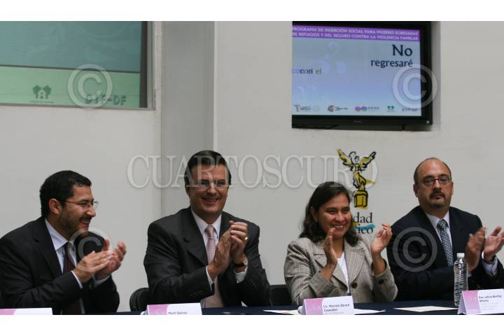 MÉXICO, D.F., 11JUNIO2008.- Martí Batres, Secretario de Desarrollo Socia, Marcelo Ebrard Casaubón, Jefe de Gobierno, Leticia Bonifaz Alonzo, Consejera Jurídica y de Asuntos Legales del Distrito Federal y José Antonio Revah, director del Instituto de Vivienda, durante la entrega de viviendas a víctimas de violencia intrafamiliar en el patio del Antiguo Palacio del Ayuntamiento. FOTO: MOISÉS PABLO/CUARTOSCURO.COM