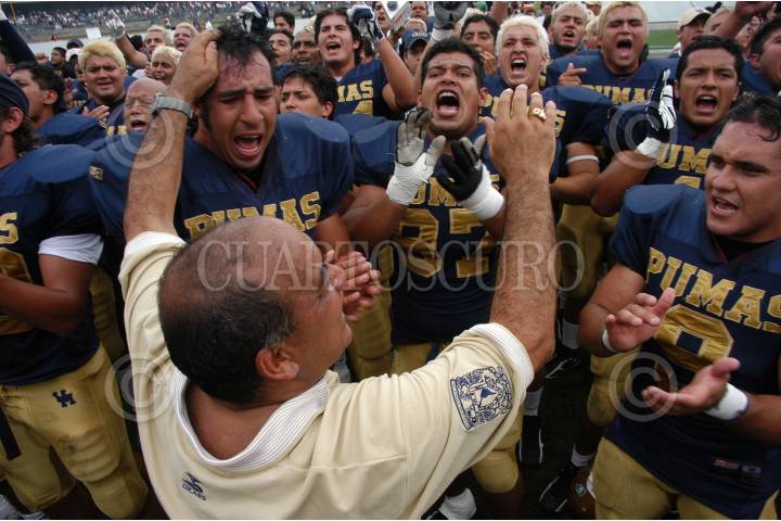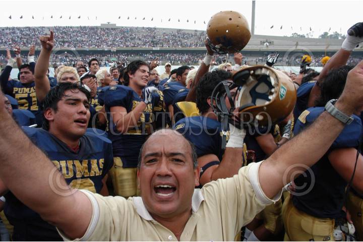 MÉXICO D.F. 9SEPTIEMBRE2006.- Pumas CU venció con marcador de 9-7 a las Águilas Blancas del IPN, en juego de temporada de liga mayor 2006 de futból americano, que se llevo acabo en el Estadio Olímpico Univarsitario. Arturo Alonzo Escobar, entrenador en jefe del equipo festeja la victoria de los Pumas. FOTO. GUILLERMO PEREA/CUARTOSCURO.COM