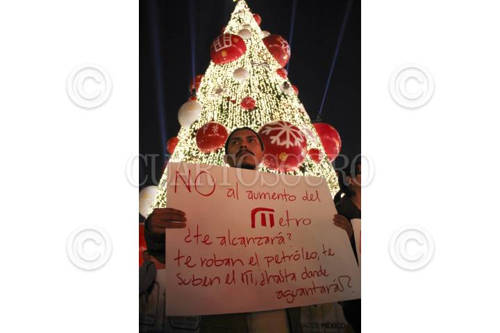 MÉXICO, D.F., 06DICIEMBRE2013.- Estudiantes y personas en lo individual, se manifestaron al pie del árbol navideño en el Zócalo, en contra de próximo aumento en la tarifa del Metro, invitando a la ciudadanía a manifestarse en contra de la decisión del gobierno Miguel Ángel Mancera. FOTO: ADOLFO VLADIMIR /CUARTOSCURO.COM
