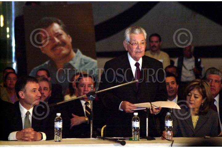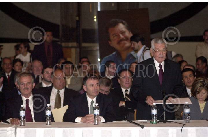 México, D.F. 10 FEBRERO 2004.- El priísta Francisco Labastida, el secretario particular del presidente Fox, Alfonso Durazo y Luis Colosio, padre del asesinado candidato priísta, durante el homenaje nacional realizado para conmemorar el 54 aniversario del nacimiento del político sonorense. FOTO: Sandra Perdomo/CUARTOSCURO.COM