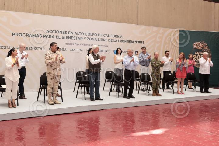 Andrés Manuel López Obrador, presidente de México encabezó el evento protocolario “Acciones en Alto Golfo de California, Programas para el Bienestar y Zona Libre de la Frontera Norte”. en Mexicali, Baja California.