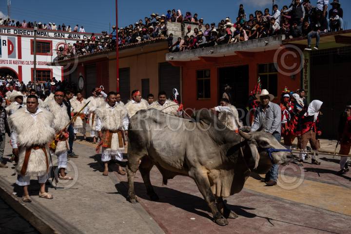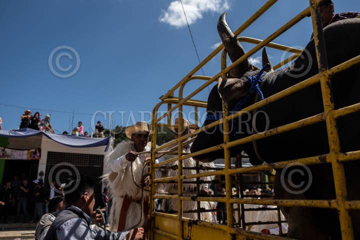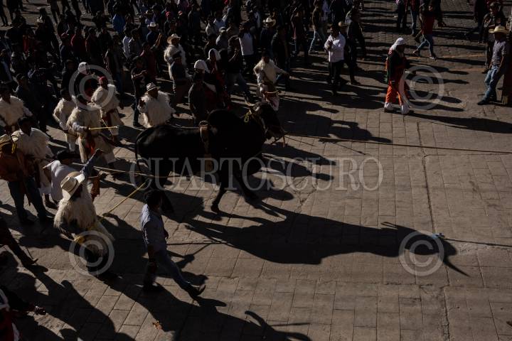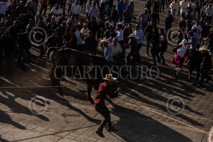 Autoridades tradicionales preparan el siguiente toro que recorrerá la plaza central.