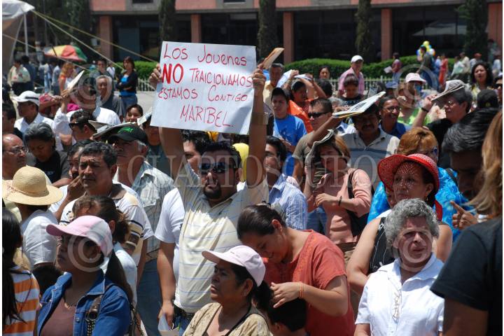 ECATEPEC, EDO. DE MÉXICO, 08JULIO2009.- Acompañada de más de 100 simpatizantes perredistas, la candidata a la alcaldía local por el PRD-PT, Maribel Alva Olvera, se manifestó frente a la junta distrital del Instituto Electoral del Estado de México (IEEM), ubicada en San Cristobal Ecatepec, y dijo desconocer el virtual triunfo del priista, Eruviel Ávila Villegas. FOTO: MARIO NULO/CUARTOSCURO.COM