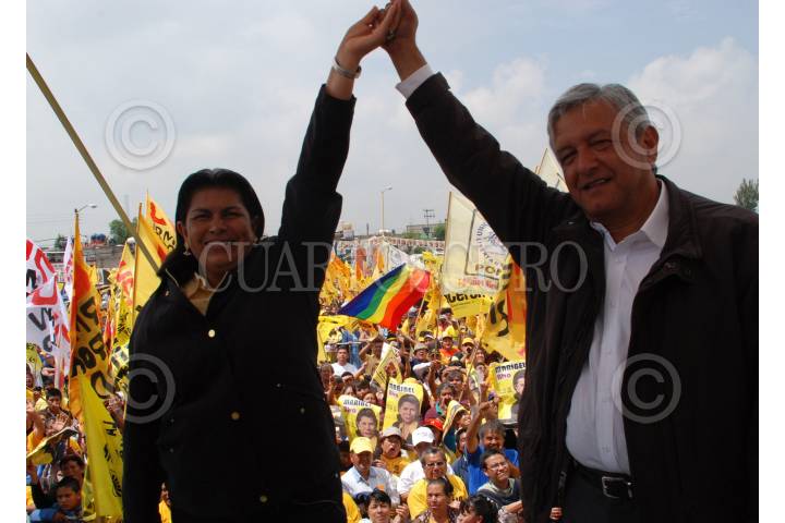 ECATEPEC, EDO. DE MÉXICO, 01JULIO2009.- Andrés Manuel López Obrador y Maribel Alva Olvera, candidata de la coalición de los Partidos de la Revolución Democrática y del Trabajo (PRD-PT) a la presidencia municipal de Ecatepec. López Obrador hizo un llamado cientos de simpatizantes perredistas, que se concentraron en el Faro del Viento, centro cultural de la zona oriente construido en esta administración municipal. FOTO: MARIO NULO/CUARTOSCURO.COM