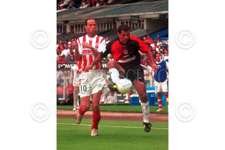 Atlas consiguió su primer triunfo del Torneo Apertura 2002, en base a contundencia y de aprovechar errores de Necaxa, al que derrotó 3-2 esta tarde en el estadio Azteca, en juego de la segunda jornada del certamen. En la gráfica Juan Rodríguez hace una finta a Luis Alves. FOTO: Juan Pablo Zamora/CUARTOSCURO.COM