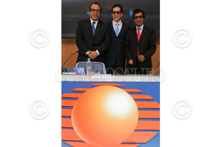 MÉXICO, D.F., 21OTCUBRE2009.- Eduardo Aguilar, representante de Sony en México junto a Javier Alarcon, director editorial de Televisa deportes y Elias Rodriguez, director general de operaciones de Televisa Chapultepec durante la conferencia de prensa que se dio para anunciar la transmisión del partido de fútbol, (América-Guadalajara) en Tercera Dimensión 3D. FOTO: ENRIQUE ORDÓÑEZ/CUARTOSCURO.COM