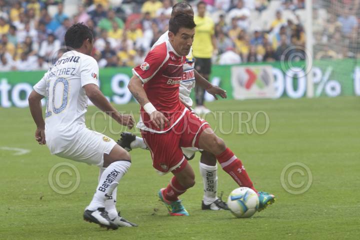 MÉXICO, D.F., 16FEBRERO2013.- El jugador del Club America, Osvaldo Martínez disputa el balón al delantero paraguayo, Edgar Benítez, de los Diablos Rojos del Toluca en la fecha 7 del Toreno de Liga Mx, que se llevó a cabo en el Estadio Azteca. Ambos equipo terminaron empatados a dos tantos por bando. FOTO: FRANCISCO J. RODRÍGUEZ /CUARTOSCURO.COM
