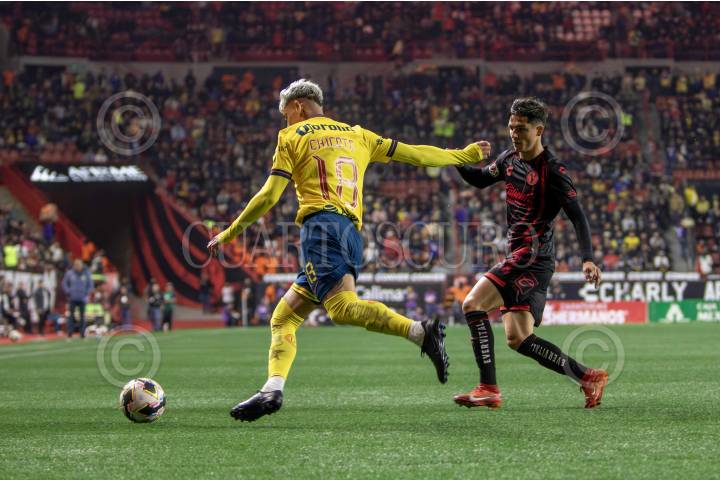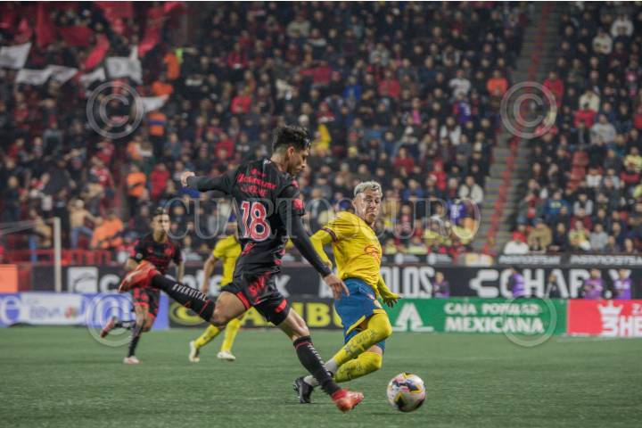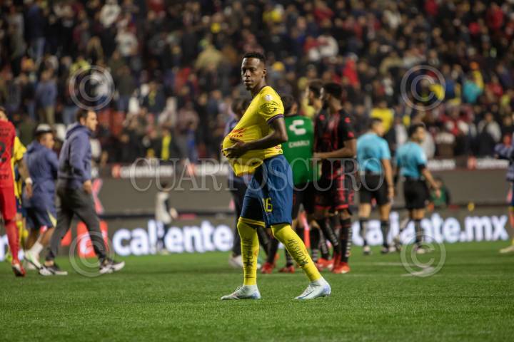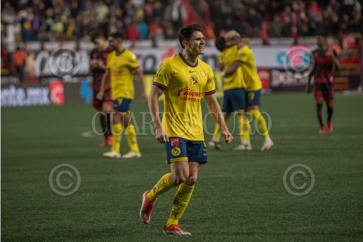 TIJUANA BAJA CALIFORNIA, 21NOVIEMBRE2024.-Christian Calderon (Chicote) del equipo de América. Xolos pierde en penales contra América, aún mantiene esperanza de liguilla. Los Xolos de Tijuana igualaron 2-2 con el América, actual bicampeón del fútbol mexicano, en su partido del play-in disputado en el Estadio Caliente. Sin embargo, en la tanda de penales, el equipo fronterizo cayó 3-2, perdiendo así su primera oportunidad de avanzar directamente a los cuartos de final de la fiesta grande del fútbol mexicano. A pesar del tropiezo, Xolos aún tiene una última oportunidad de clasificar a la liguilla. Su posición en la tabla general los coloca frente al Atlas en un duelo crucial el próximo domingo. Este partido único definirá el pase a los cuartos de final y la continuidad de los Xolos en la lucha por el campeonato.La afición fronteriza se mantiene esperanzada de que su equipo pueda sobreponerse y asegurar su lugar en la fase final del torneo.FOTO: CHRIS NOYOLA/CUARTOSCURO.COM