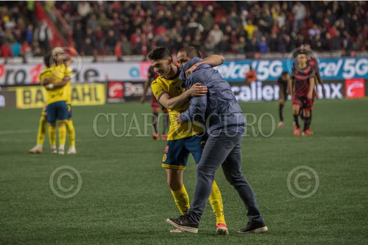 TIJUANA BAJA CALIFORNIA, 21NOVIEMBRE2024.-Israel Reyes del equipo del América abrazando al director del equipo. Xolos pierde en penales contra América, aún mantiene esperanza de liguilla. Los Xolos de Tijuana igualaron 2-2 con el América, actual bicampeón del fútbol mexicano, en su partido del play-in disputado en el Estadio Caliente. Sin embargo, en la tanda de penales, el equipo fronterizo cayó 3-2, perdiendo así su primera oportunidad de avanzar directamente a los cuartos de final de la fiesta grande del fútbol mexicano. A pesar del tropiezo, Xolos aún tiene una última oportunidad de clasificar a la liguilla. Su posición en la tabla general los coloca frente al Atlas en un duelo crucial el próximo domingo. Este partido único definirá el pase a los cuartos de final y la continuidad de los Xolos en la lucha por el campeonato.La afición fronteriza se mantiene esperanzada de que su equipo pueda sobreponerse y asegurar su lugar en la fase final del torneo.FOTO: CHRIS NOYOLA/CUARTOSCURO.COM