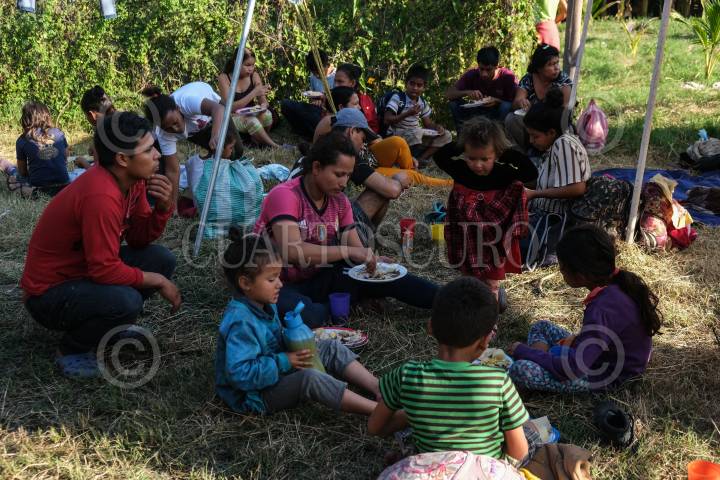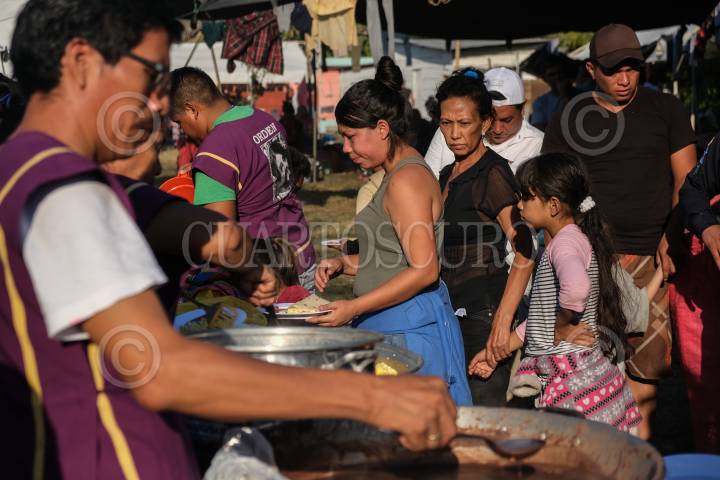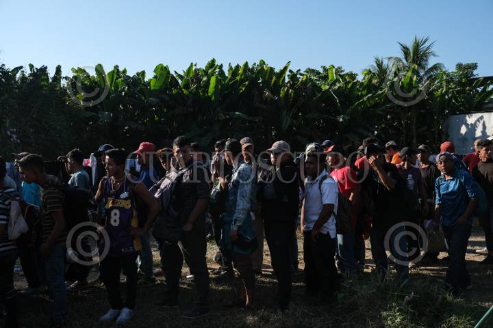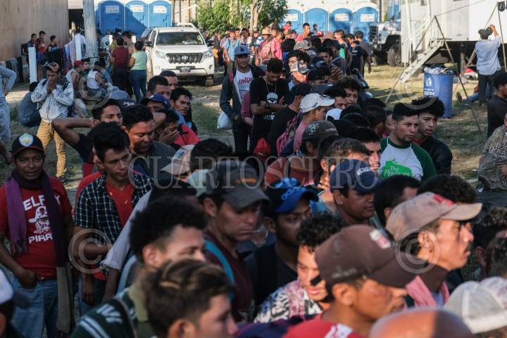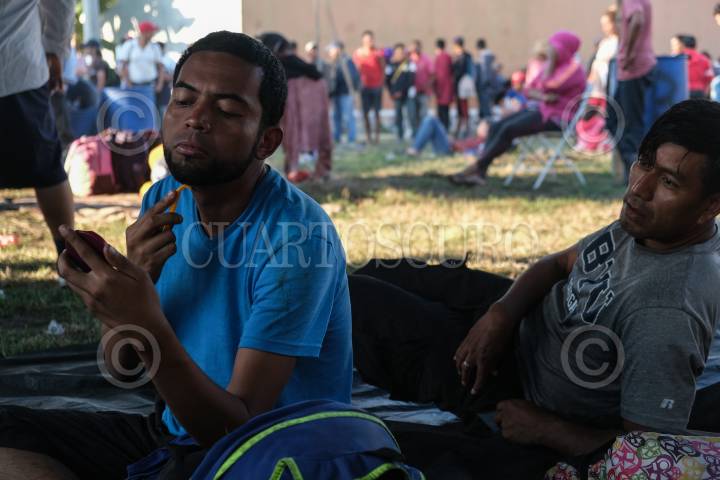 Migrantes centroamericanos esperar por desayunos otorgados por la iglesia católica y ACNUR.