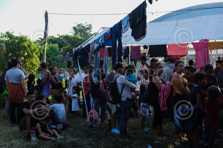 Un migrantes centroamericana pone su ropa a secar e una estructura de bambú en un albergue provisional instalado por autoridades guatemaltecas.