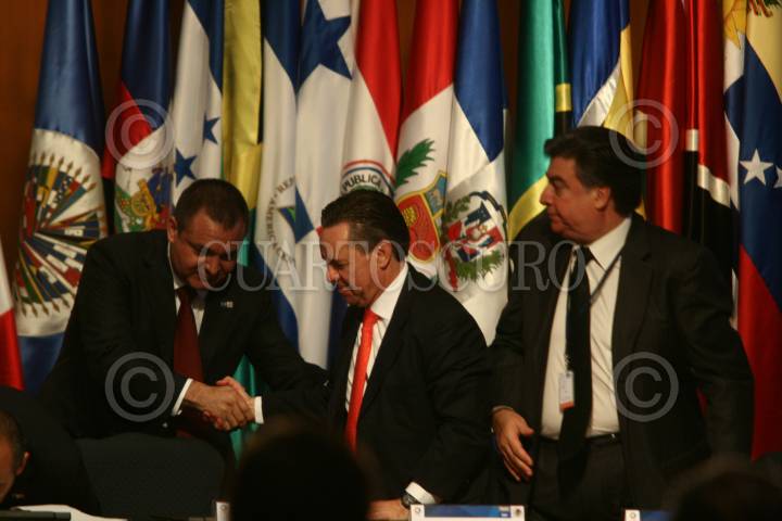 MÉXICO, D.F., 07OCTUBRE2008.- El procurador de la Republica, Eduardo Medina Mora, saluda a Genaro Garcia Luna, secretario de la SSP, donde el titular del Ejecutivo inaguró esta mañana los trabajos de la primera reunión de ministros en materia de seguridad pública de las Américas. FOTO: SÁSHENKA GUTIÉRREZ/CUARTOSCURO.COM